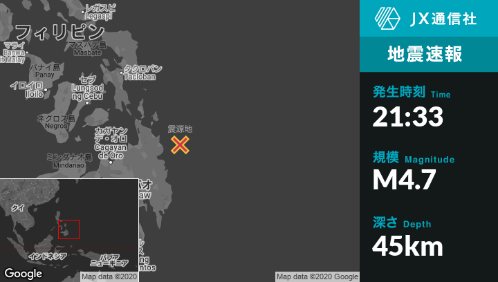 | 震源地 | フィリピンのCagwaitから東北東62kmの地点 |