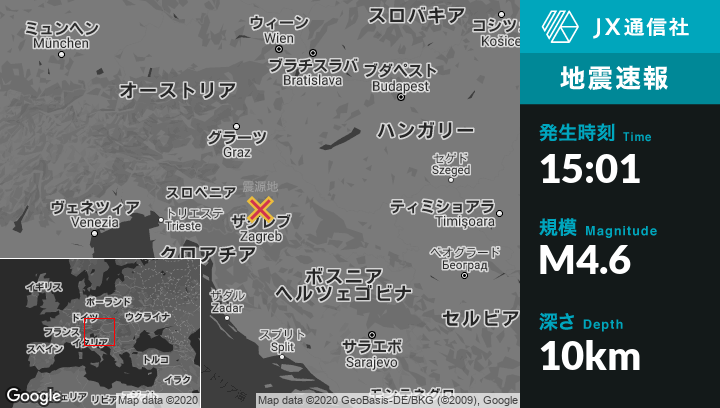 | 震源地 | クロアチアのKasinaから西南西4kmの地点 |