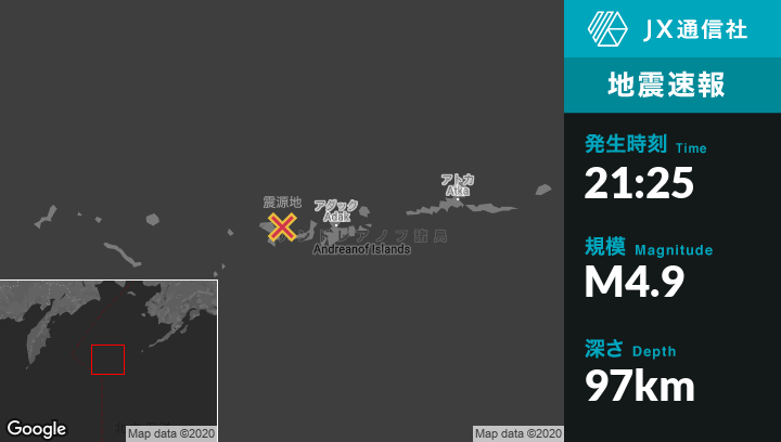 | 震源地 | アラスカのTanaga Volcanoから東北東27kmの地点 |