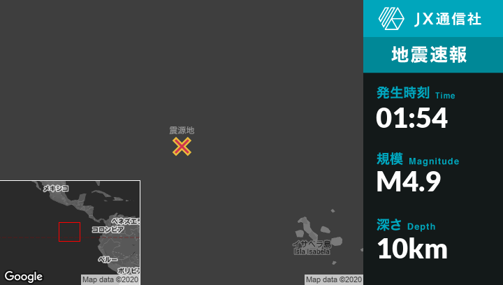 3月25日 01:54頃、エクアドルのPuerto Villamilから北西607kmの地点でM4.9の地震がありました。