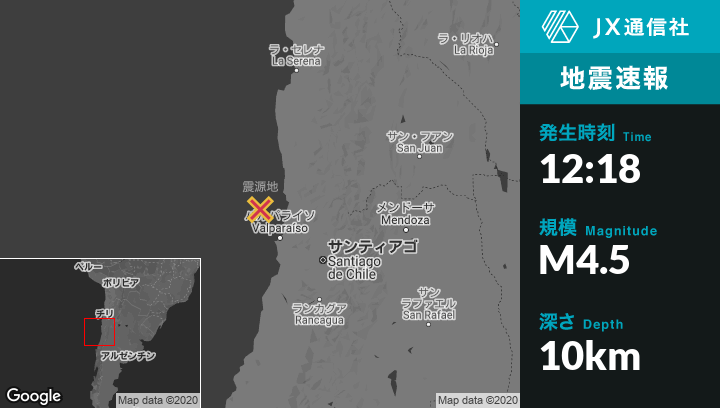 3月28日 12:18頃、チリのLa Liguaから西77kmの地点でM4.5の地震がありました。