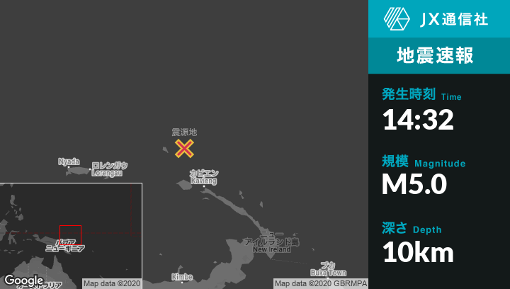 3月28日 14:32頃、パプアニューギニアのKaviengから北北西158kmの地点でM5.0の地震がありました。