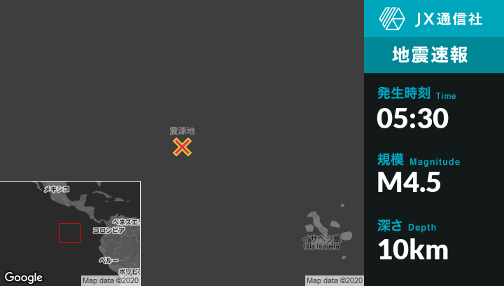 3月29日 05:30頃、エクアドルのPuerto Villamilから北西620kmの地点でM4.5の地震がありました。