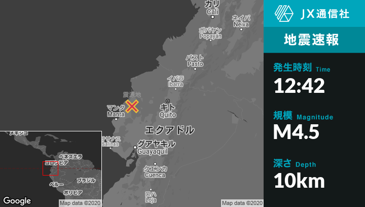 3月30日 12:42頃、エクアドルのPedernalesから南41kmの地点でM4.5の地震がありました。