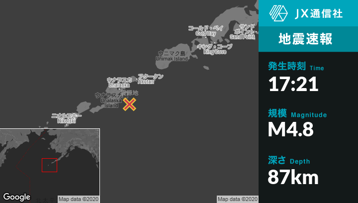 | 震源地 | アラスカのUnalaskaから南東45kmの地点 |