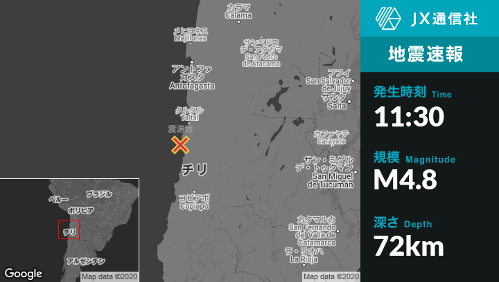 4月02日 11:30頃、チリのTaltalから南南西65kmの地点でM4.8の地震がありました。
