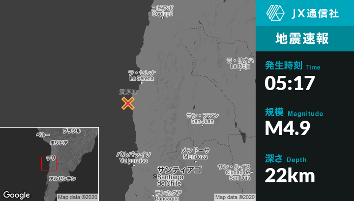 4月04日 05:17頃、チリのOvalleから西63kmの地点でM4.9の地震がありました。