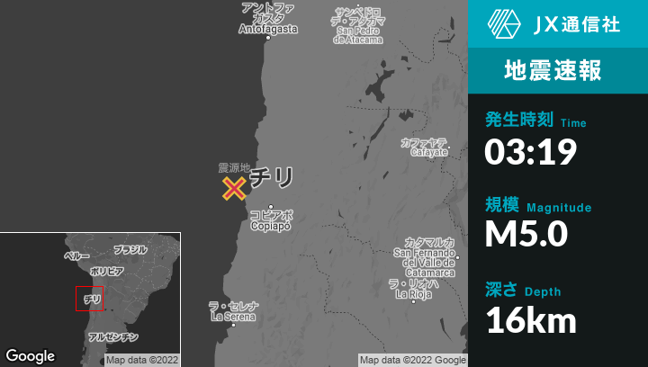 | 震源地 | チリのCopiapóから西北西105kmの地点 |