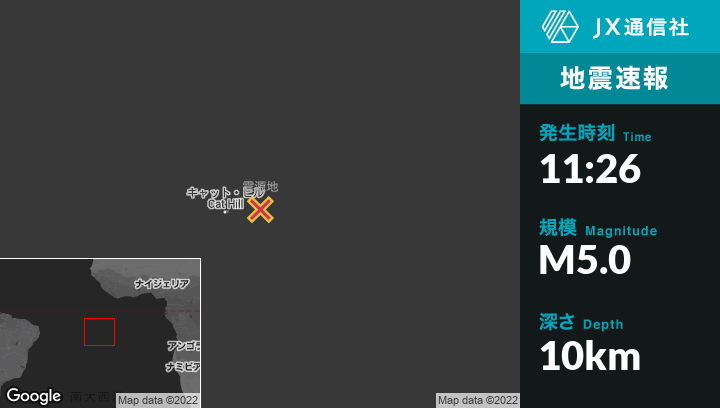 6月12日 11:26頃、セントヘレナのGeorgetownから東北東85kmの地点でM5.0の地震がありました。