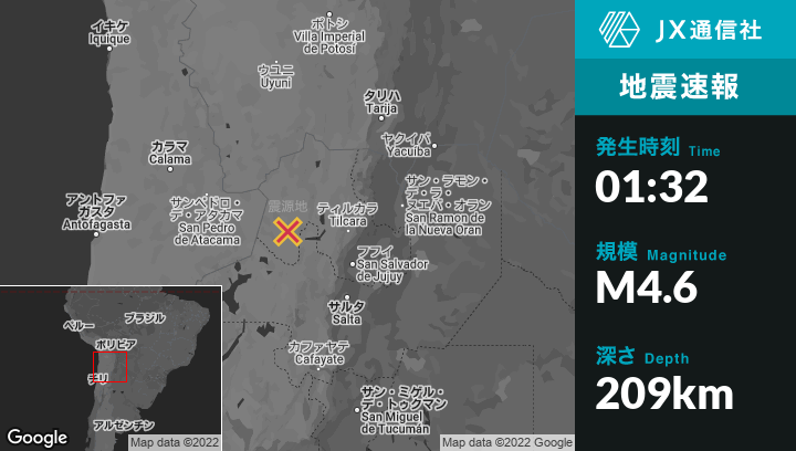 | 震源地 | アルゼンチンのSan Antonio de los Cobresから北北西85kmの地点 |