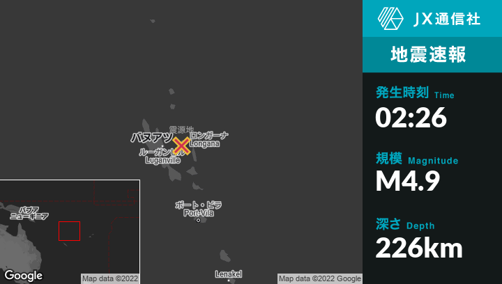 | 震源地 | バヌアツのLuganvilleから東北東68kmの地点 |