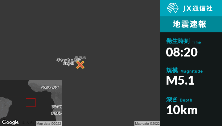 6月14日 08:20頃、セントヘレナのGeorgetownから東北東94kmの地点でM5.1の地震がありました。
