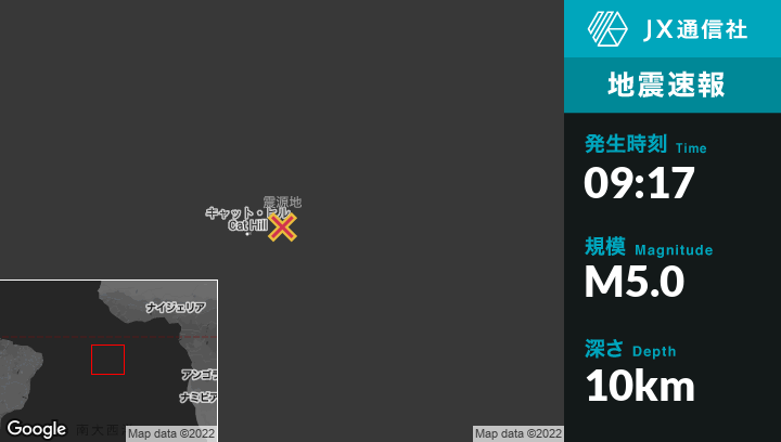 6月14日 09:17頃、セントヘレナのGeorgetownから東北東82kmの地点でM5.0の地震がありました。