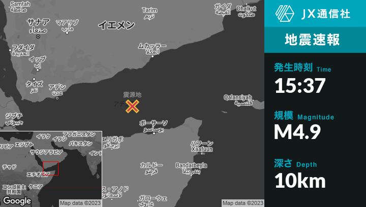 6月03日 15:37頃、ソマリアのLas Khoreyから北153kmの地点でM4.9の地震がありました。