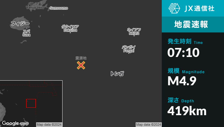 | 震源地 | トンガのHoumaから西北西265kmの地点 |