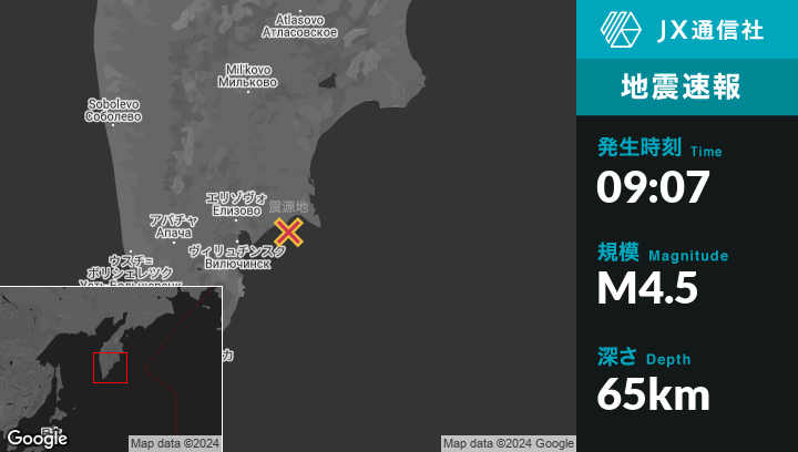 | 震源地 | ロシアのPetropavlovsk-Kamchatskyから東52kmの地点 |