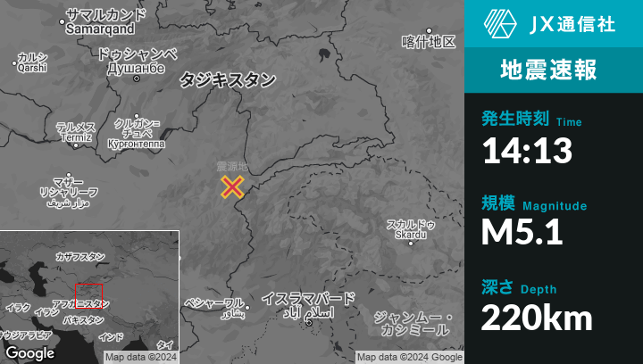 11月13日 14:13頃、アフガニスタンのAshkāshamから西南西37kmの地点でM5.1の地震がありました。