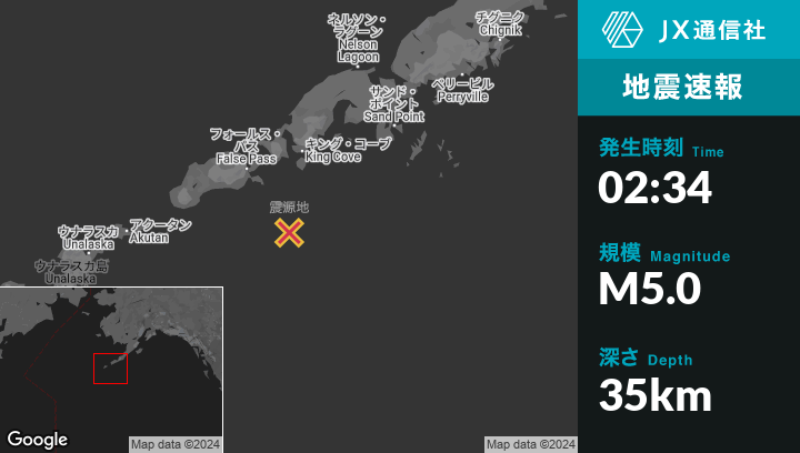 | 震源地 | アラスカのFalse Passから南東91kmの地点 |