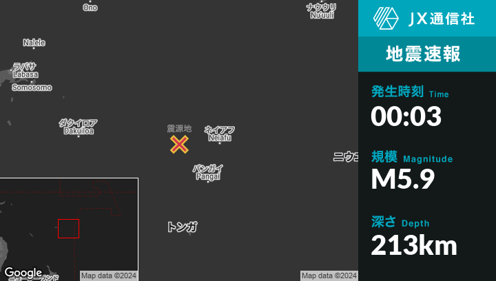 12月16日 00:03頃、トンガのNeiafuから西136kmの地点でM5.9の地震がありました。