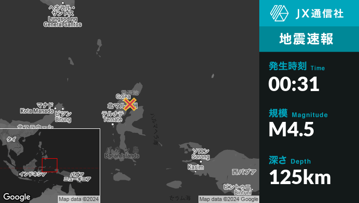 | 震源地 | インドネシアのTobeloから東北東12kmの地点 |