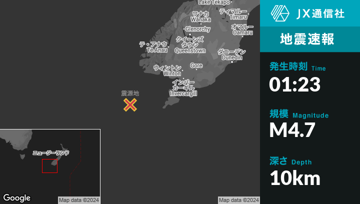 | 震源地 | ニュージーランドのRivertonから西南西172kmの地点 |