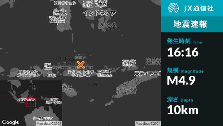 12月16日 16:16頃、インドネシアのRutengから北東102kmの地点でM4.9の地震がありました。
