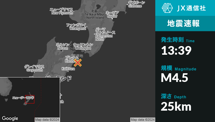 | 震源地 | ニュージーランドのWitherleaから南東49kmの地点 |