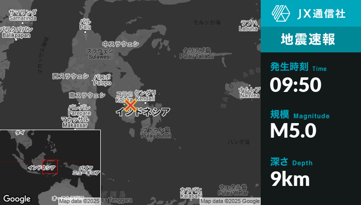 1月29日 09:50頃、インドネシアのKendariから西72kmの地点でM5.0の地震がありました。