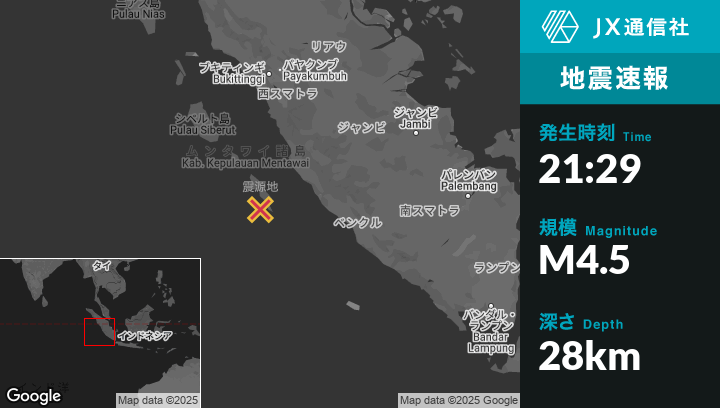 | 震源地 | インドネシアのTuapejatから南南東141kmの地点 |