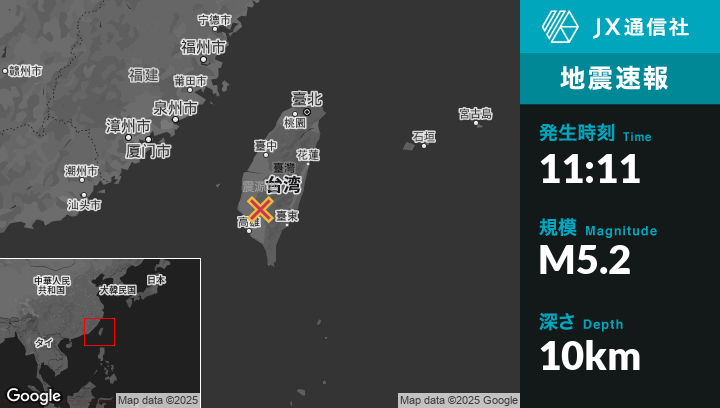 1月30日 11:11頃、台湾のYujingから北東11kmの地点でM5.2の地震がありました。
