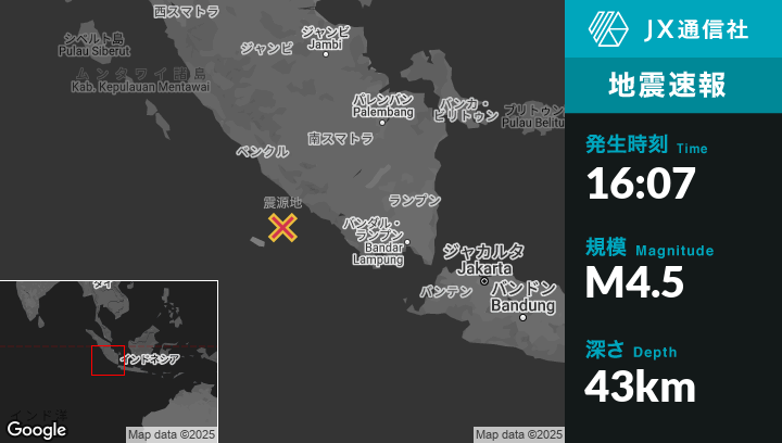 | 震源地 | インドネシアのPagar Alamから南南西118kmの地点 |