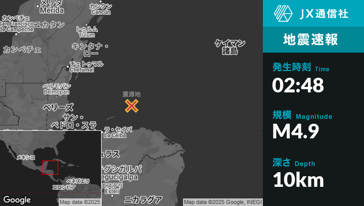 2月02日 02:48頃、ホンジュラスのSavannah Bightから北北東69kmの地点でM4.9の地震がありました。