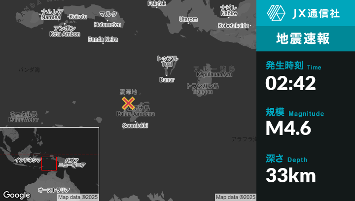 | 震源地 | インドネシアのTualから南西249kmの地点 |