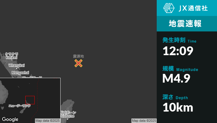 2月05日 12:09頃、ニュージーランドのHicks Bayから北257kmの地点でM4.9の地震がありました。