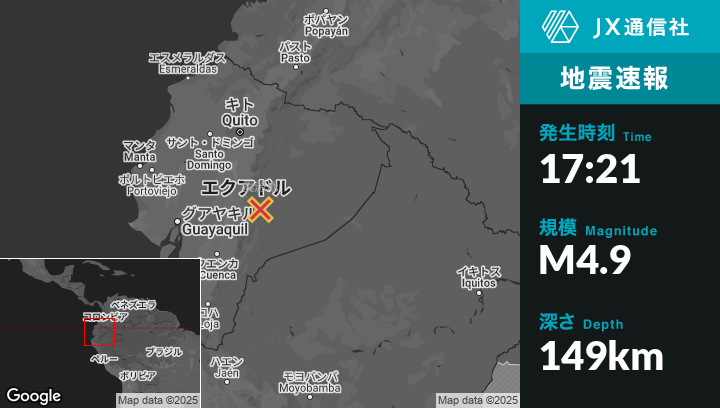 2月05日 17:21頃、エクアドルのPaloraから南西16kmの地点でM4.9の地震がありました。