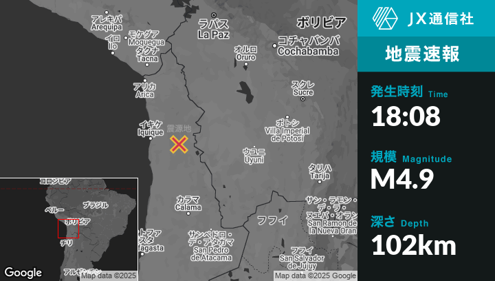 2月05日 18:08頃、チリのLa Tiranaから東44kmの地点でM4.9の地震がありました。