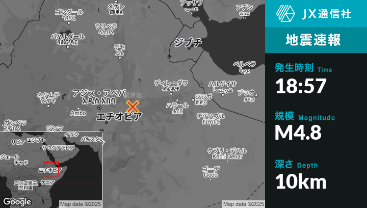 | 震源地 | エチオピアのĀwashから北20kmの地点 |