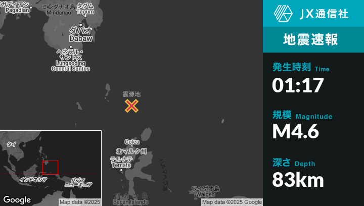 | 震源地 | インドネシアのTobeloから北218kmの地点 |