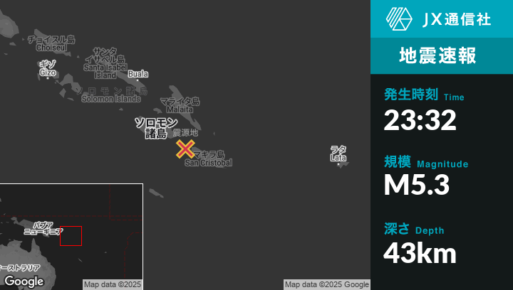 2月09日 23:32頃、ソロモン諸島のKirakiraから西北西98kmの地点でM5.3の地震がありました。