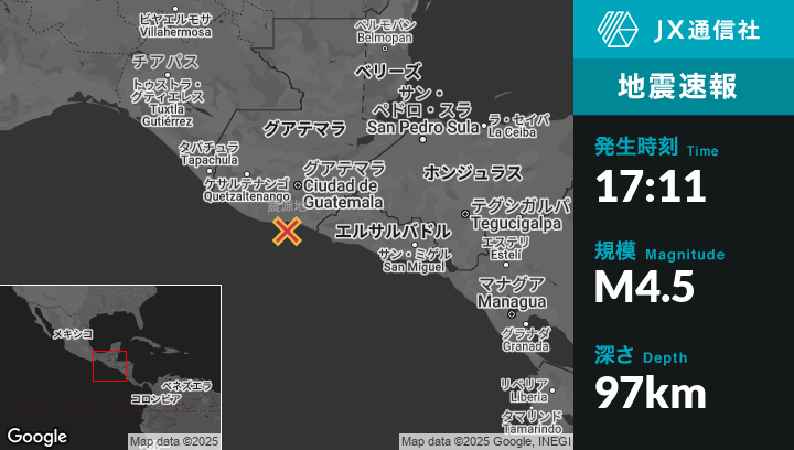 2月10日 17:11頃、グアテマラのIztapaから南8kmの地点でM4.5の地震がありました。