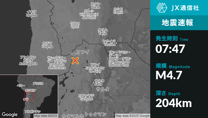 2月11日 07:47頃、アルゼンチンのEl Aguilarから西116kmの地点でM4.7の地震がありました。