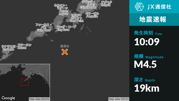 2月11日 10:09頃、アラスカのKing Coveから南南東136kmの地点でM4.5の地震がありました。