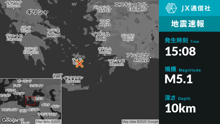 2月18日 15:08頃、ギリシャのOíaから北東27kmの地点でM5.1の地震がありました。