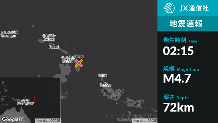 2月20日 02:15頃、パプアニューギニアのKokopoから東北東84kmの地点でM4.7の地震がありました。
