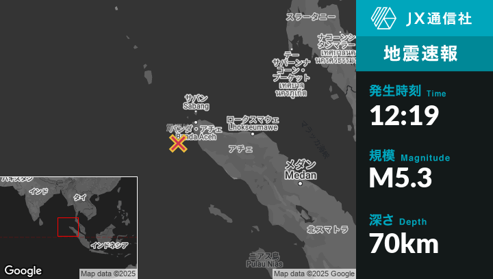 | 震源地 | インドネシアのBanda Acehから南西88kmの地点 |