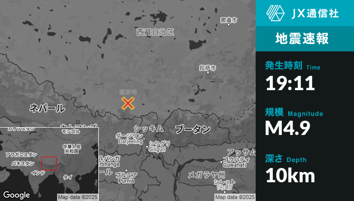 2月21日 19:11頃、ネパールのLobucheから北東98kmの地点でM4.9の地震がありました。
