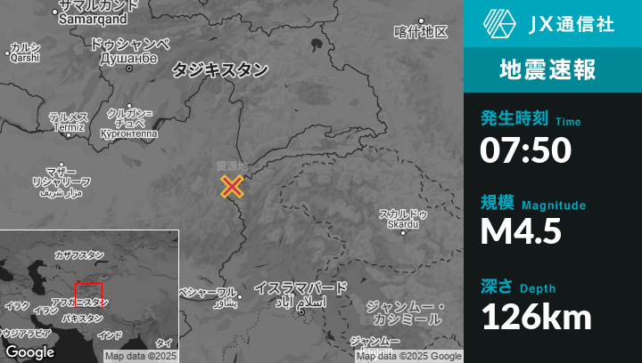 2月22日 07:50頃、アフガニスタンのAshkāshamから南南西41kmの地点でM4.5の地震がありました。
