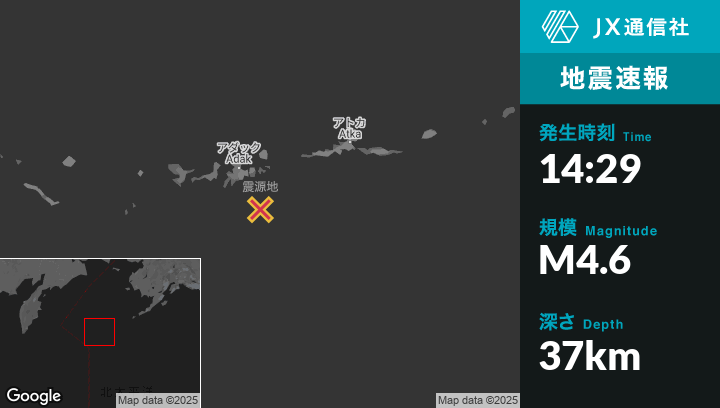 3月21日 14:29頃、アラスカのAdakから南南東64kmの地点でM4.6の地震がありました。