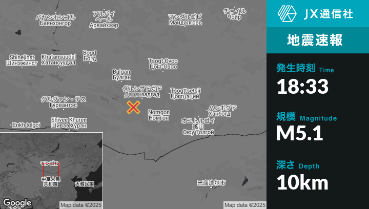| 震源地 | モンゴルのDalandzadgadから西南西37kmの地点 |