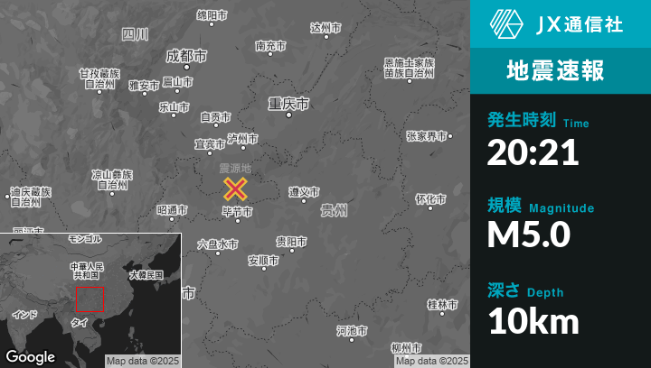 | 震源地 | 中国のXuyongから西南西20kmの地点 |